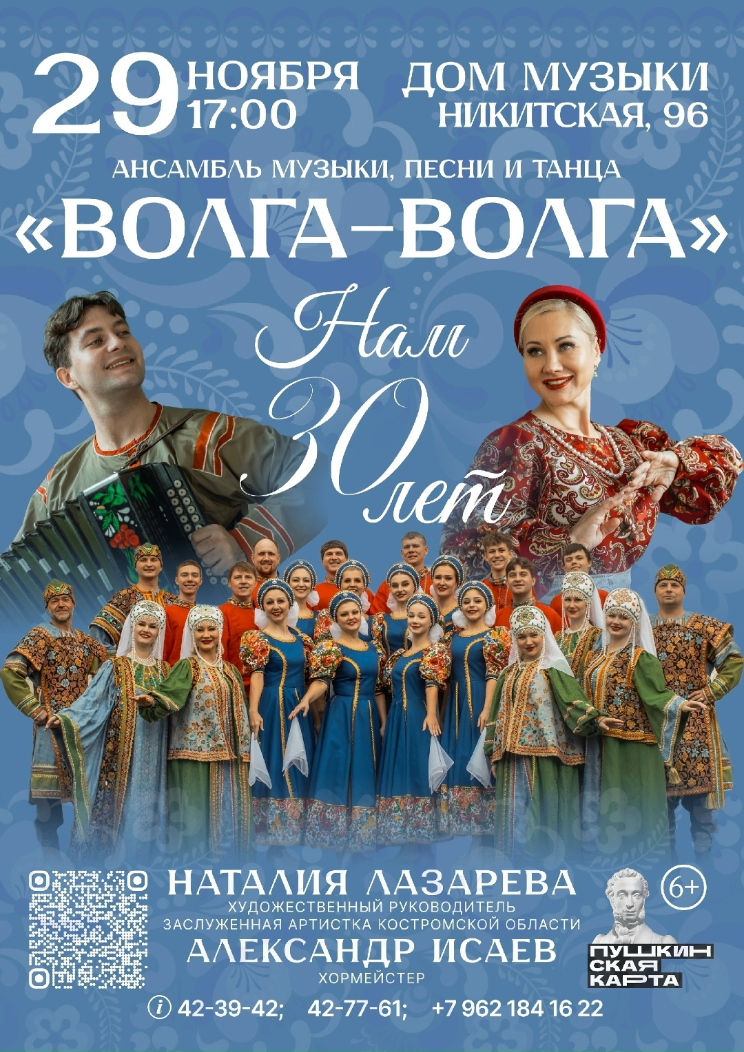 29 ноября в 17:00 часов в Доме музыки (ул. Никитская, д. 96) состоится юбилейный концерт ансамбля музыки, песни и танца «Волга-Волга».