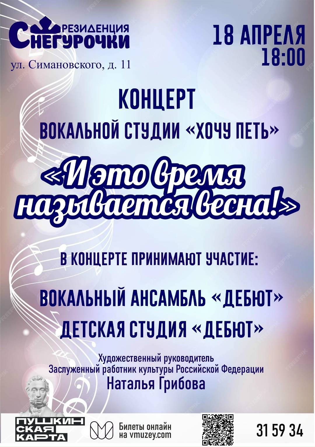 18 апреля 18:00 часов в Резиденции Снегурочки (ул. Симановского, 11) состоится концерт «И это время называется весна!» студии вокала «Хочу петь» с участием вокального ансамбля «Дебют» и детской студии «Дебют».