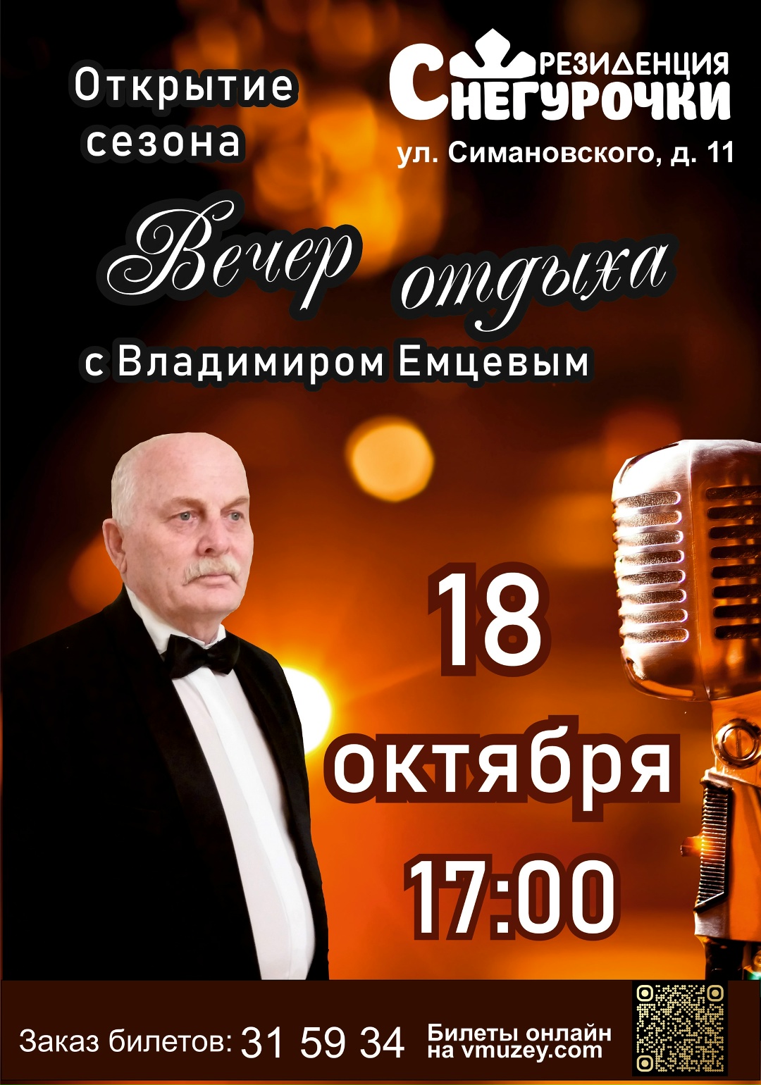 Лауреат всероссийских фестивалей и конкурсов Владимир Емцев приглашает костромичей и гостей города на Вечер отдыха. В программе концертная и танцевальная программа, тематические конкурсы, а самое главное – живое общение. Вечер отдыха состоится в зале Резиденции Снегурочки.