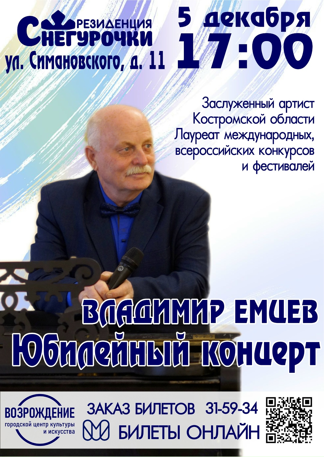 5 декабря (пятница) в 17:00 часов в Резиденции Снегурочки (ул. Симановского, 11) состоится Юбилейный концерт солиста культурно центра "Возрождение" Владимира Емцева.